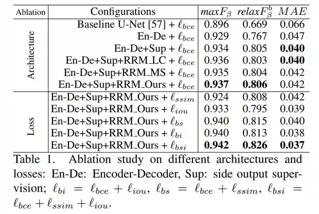 研究者首先验证了模型中每个关键组件的有效性。控制变量研究包含两部分内容:架构和损失,并且相关实验在 ECSSD 数据集上展开。