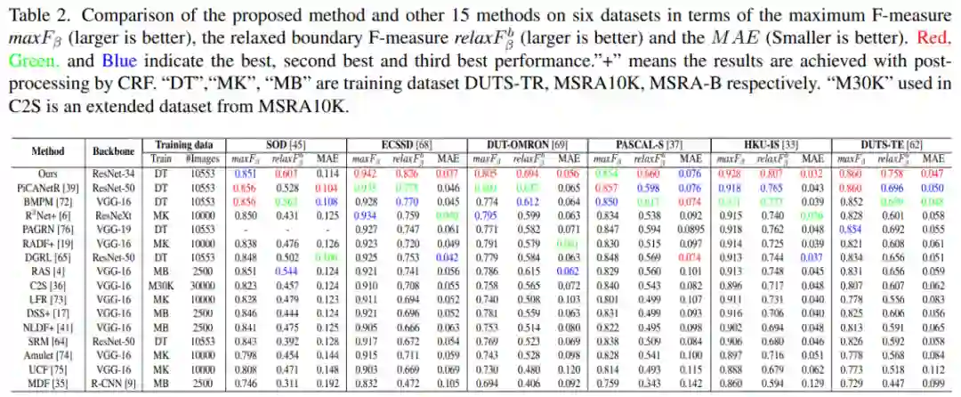 如下表 2 所示,研究者展示了 BASNet 与其他 15 种方法在 SOD、ECSSD 等 6 个数据集上的最大 F-measure(maxF_β)、relaxed boundary F-measure(relaxF^b_β)和 MAE 结果比较: