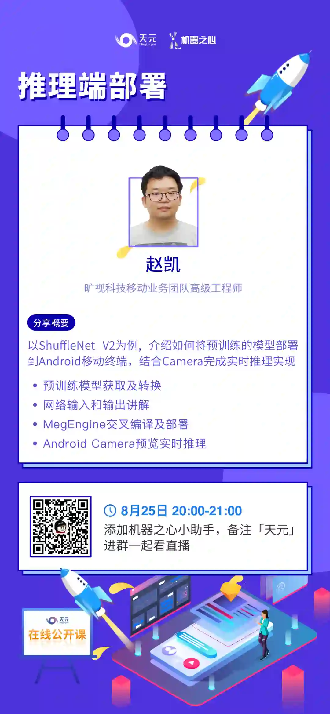 8月25日,旷视科技移动业务团队高级工程师赵凯将带来等5课《推理端部署》,将以ShuffleNet V2为例, 介绍如何将预训练的模型部署到 Android 移动终端,结合Camera完成实时推理实现。欢迎大家入群学习。