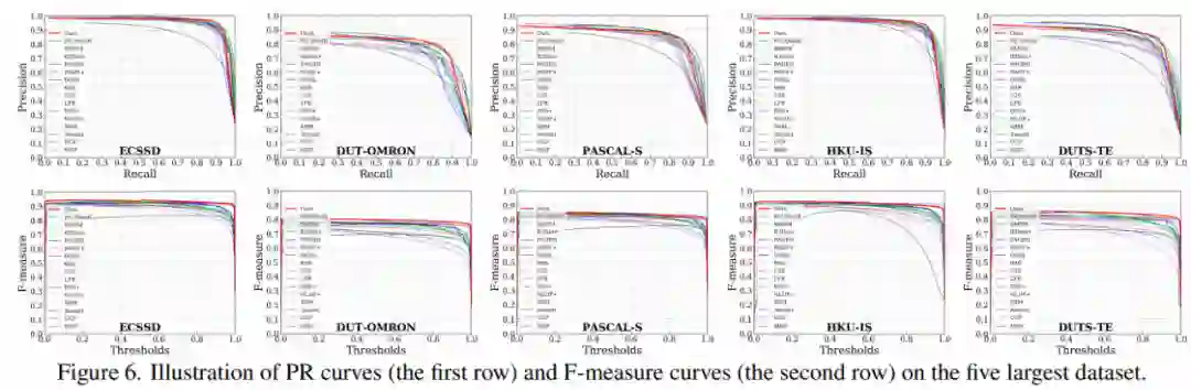 此外,为了评估分割显著性目标(salient object)的质量,研究者在图 6 中展示了 ECSSD、DUT-OMRON、PASCAL-S、HKU-IS 和 DUTS-TE 等 5 个最大数据集的 PR 曲线和 F-measure 曲线。