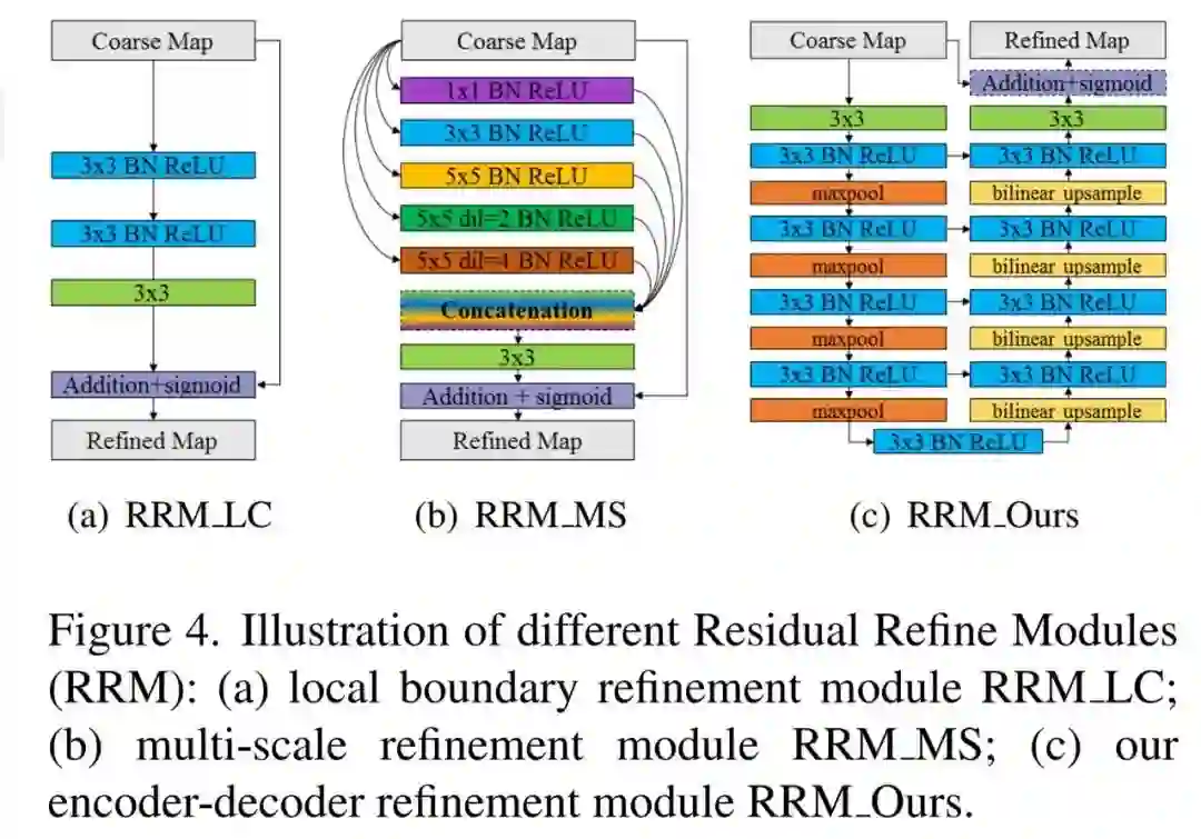 为了在粗略显著图中同时优化区域和边界,研究者提出了一种新的残差优化模块,它采用残差编码器 - 解码器架构 RRM_ Ours(如上图 2 和下图 4(c) 所示)。