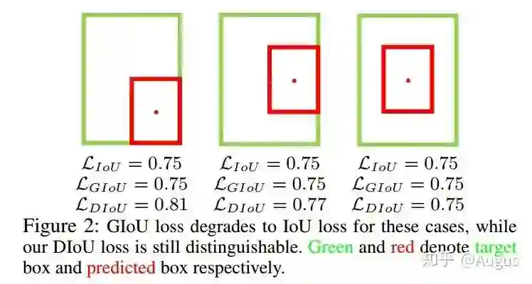 当目标框完全包裹预测框的时候,IoU和GIoU的值都一样,此时GIoU退化为IoU, 无法区分其相对位置关系,如下图三种情况GIOU loss是完全一致的。