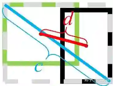 其中 表示欧式距离,分子d表示GT框和Inference框中心点距离的平方,分母c表示GT框和Inference框最小外接矩形的对角线距离。