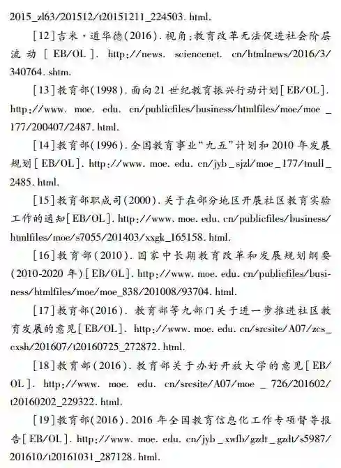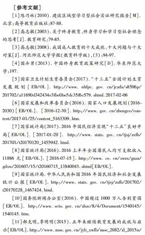 保障民生、改善民生,创新社会治理,推动经济社会协调与可持续发展,构建稳定、健康、和谐社会是21世纪我国社会建设的目标。在党和国家长期的努力下,我国社会贫困情况明显改善,2016年1000万人脱贫,人口贫困率下降到5.7%(国务院新闻办公室,2016)。人民参与公共事务和公益事业热情亦空前高涨。但依然需要清醒的是,发展也在不同程度上导致生态环境恶化、自然资源短缺、城乡社区分离、弱势群体返贫以及社会公共参与能力欠缺等诸多困境(中华人民共和国环境保护部,2016)。此外,2016年我国的基尼系数为0.465,仍处于世界高水平,城乡居民收入差距为2.72倍。⑤显然,所有这些经济社会问题都需要进一步得到密切关注和妥善解决。社会总体稳定和健康发展,基本公共服务体系不断完善,给各级各类教育发展与改革提供了基础保障和支持环境。但需要注意到,有关社会动态不平等的事实给出的警示是:教育在促进社会平等方面的功效并不尽如人意(吉米·道华德,2016)。也就是说,若要真正发挥终身教育在促进社会健康流动,提升社会发展活力,不让“有人掉队”,显然还需要加强教育与社会之间更加理性的认识和系统的规划。