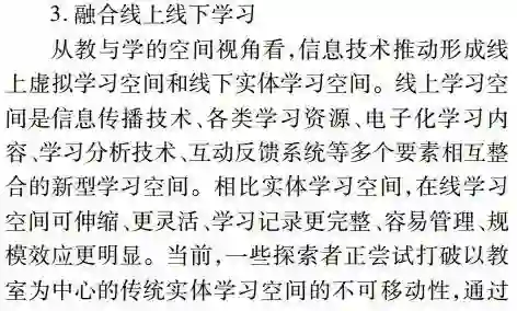 终身教育体系建设过程中,人们的学习方式亦须秉持多样化发展的原则。实践表明,传统面授学习和线上数字化学习相结合的混合式学习正在成为一种全新的潮流。“翻转课堂”融合课外自主学习、课堂辅导、同伴交流等多种形式,有利于提升学习热情、增强学习效果;以微信公众号为发布平台的课程教学则组合了寓所自学(书面或视频学习)、家长辅导、网络答疑、群内交流、同伴互学等多种方法相结合的学习方式。在大力倡导教育、学习融入生活、实践的背景下,体验学习也正在成为民众终身学习的全新方式。所有这些,都让终身教育处在对于教育教学方式做出重新选择的新的起跑线上,需要给予关注与探索、改善与运用。