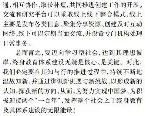 过往认知与实践经历的回溯,以及对现实机遇和挑战的分析,为学习型社会创建、终身教育体系建设提供了多方面、多层次的前行坐标。基此,下文试以全景视野,顺应时代趋势,提出发展思路与对策。