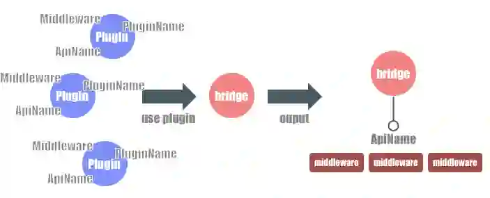 Bridge现在的设计采用插件的形式来注入一系列API,每个插件都有插件名、API名、中间件三个属性,注入Bridge后,Bridge会将相同API名的插件整合在一起,让这个API的实现指向这些插件带有的中间件的