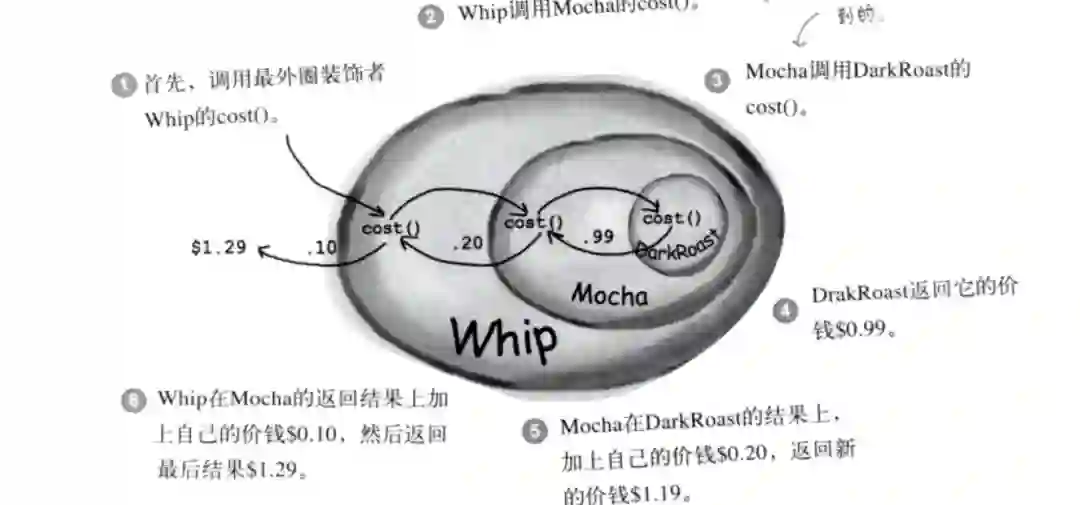 这是他举的咖啡计算价格的例子,看到这张图不是特别眼熟么,这和我们最开始说的洋葱模型非常相近,这也再一次证明了其实我们用的“中间件设计模式”其实就是“装饰者模式”。