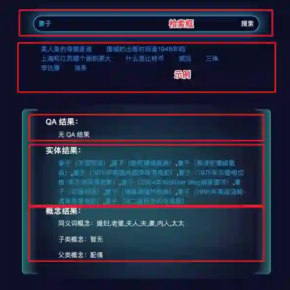 概念查询:支持mention-level的概念关键词查询,返回相关的上下位概念和同义词概念,例如“妻子”的父类(上位)概念为“配偶”,同义概念包括“媳妇”、“老婆”等