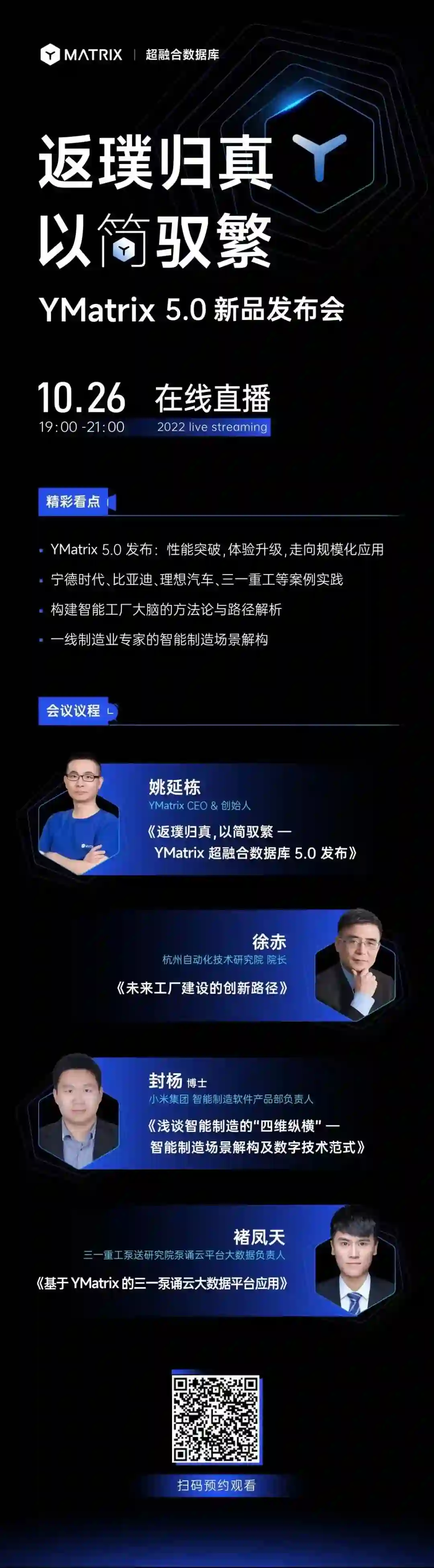 10月26日晚7点,Matrix 超融合数据库产品发布会将通过在线直播的方式举行,正式发布全新的 YMatrix 5.0 版本。多位来自产业一线的业务专家将共同出席,解构产业数字化转型中庞杂的场景需求,分享转型经验、最佳路径及技术范式,欢迎感兴趣的朋友扫码观看直播。(识别下方图片二维码预约观看直播)