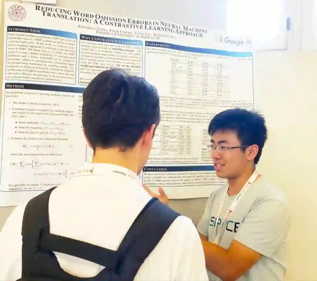 杨宗瀚说:“我们发现,目前的机器翻译总会出现一些漏词错误。”而如果能够修正这些错误,就可以提高机器翻译系统的翻译质量。基于这一思路,杨宗瀚接下来参与了关于改善机器翻译效果的相关研究,其中一项基于对比学习减少机器翻译漏词错误的工作,在 2019 年被国际计算语言学协会会议(ACL)收录 [5],杨宗瀚是这篇论文的第一作者。