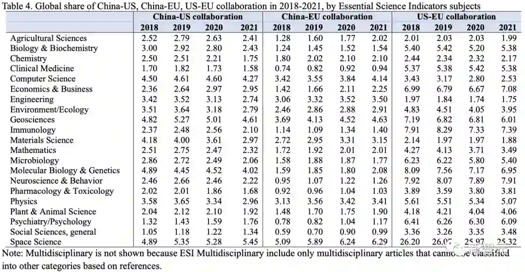 将2018年至2021年期间的论文按基本科学指标(ESI)科目划分后,可以进一步发现,中美两国在大多数研究领域的接触正在不断减少。