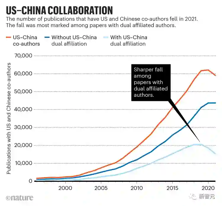 而在去年,中美作者合作的论文数量首次出现下降。