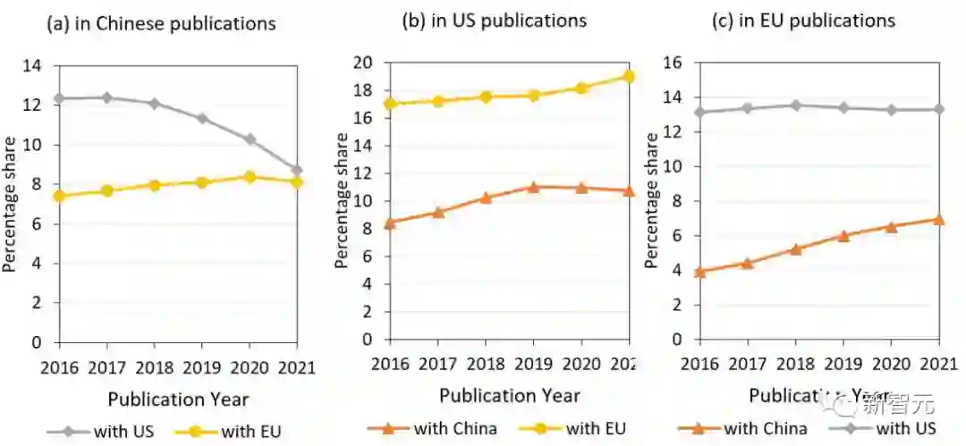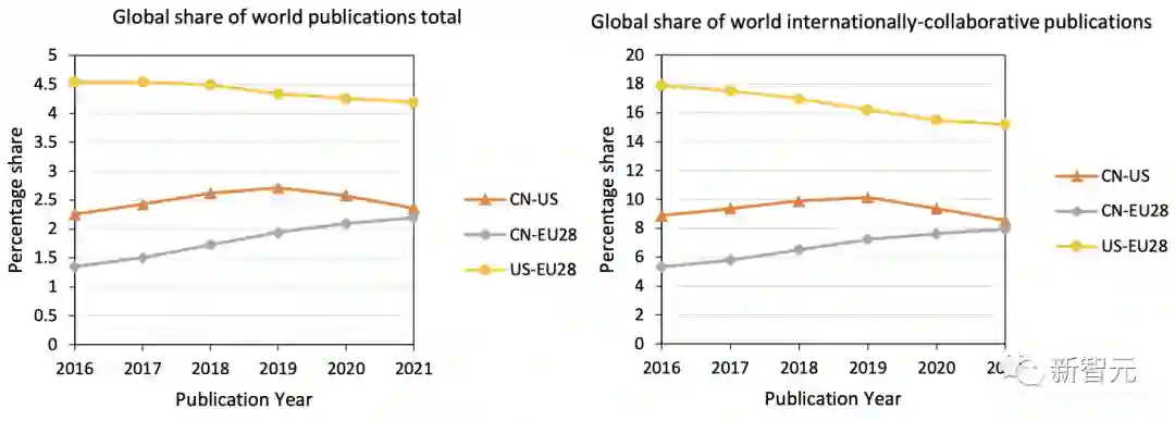 数据显示,中美合著的论文在全球的份额正在下降,而来自中国和欧盟的合著论文反而有一定的上升。