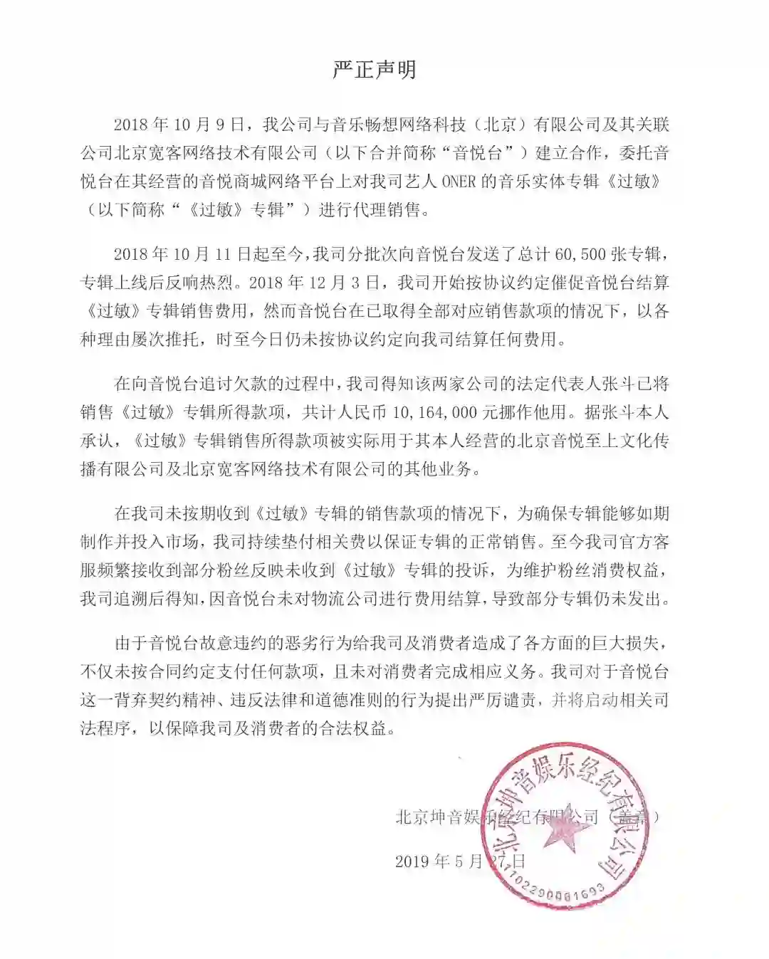 今年5月27日,名为#坤音斥音悦台违约#的话题被粉丝顶上了热搜,起因是@坤音娱乐发布相关声明,称音悦台没有按照合约支付坤音旗下艺人@ONER的《过敏》专辑售卖款项。