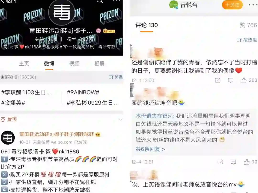 而从音悦台在微博上的账号来看,旗下@韩流音悦台账号在11月底就已经被变卖,置顶更换上了莆田鞋的售卖信息;