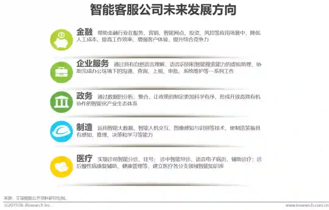 由于客服行业中智能化需求上升,除原有的客服机器人厂商外,拥有丰富大客户资源的传统客服软件厂商、基于PaaS云通讯优势的云客服厂商、互联网巨头公司的相关客服平台都开始组建自身的AI团队,布局智能客服。智能客服最大的隐性价值在于NLP技术在实际场景中的训练和标准化数据累积,后者在挖掘客户有价值信息中明显起到降本增效的作用,标准化的数据打通了企业内部营销、产品等环节,使得智能客服业务拥有了向企业服务其他场景拓展的能力;而NLP技术将成为智能客服公司的核心竞争力,可以此向制造、政务、医疗等领域拓展,向集认知、交互、协同、功能性于一身的智能系统发展。