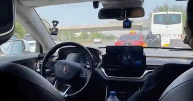 两辆大车在右侧车道发生了剐蹭,不仅占用了最右侧车道,而且还压着了变道线……恰好给需要右转的无人化Robotaxi添了堵。