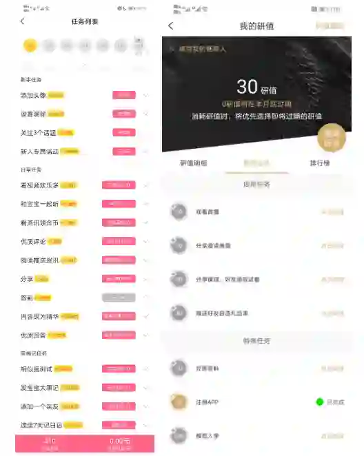 比如:下图中左边为宝宝知道产品的积分任务,不知道其激励目标是啥;右边是混沌大学的积分任务,一看就知道其激励目的是作为传播工具,引导用户分享传播。