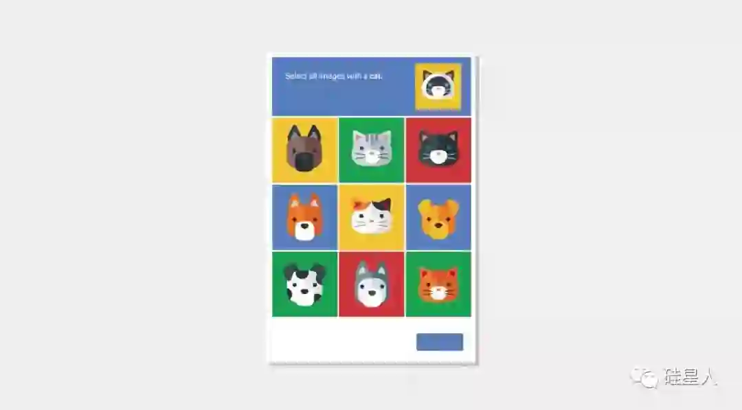 除了标注门牌路牌,让用户帮忙给数据库分类也是常见的形式之一。比如下图这种请用户“挑出所有有猫的图片”的验证码。