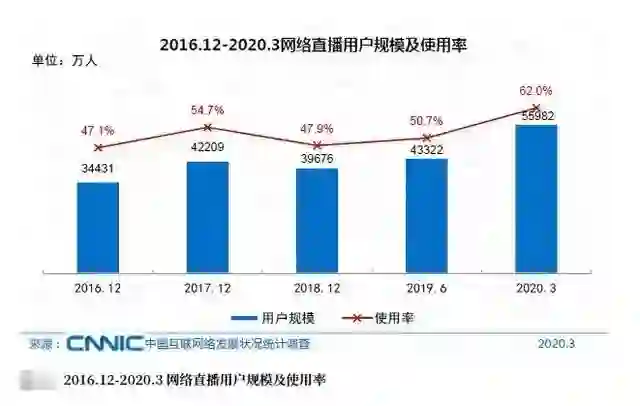 第45次《中国互联网络发展状况统计报告》显示,截至2020年3月,国内网络直播用户规模达5.6亿,较2018年底增长1.63亿,占网民整体的62%。