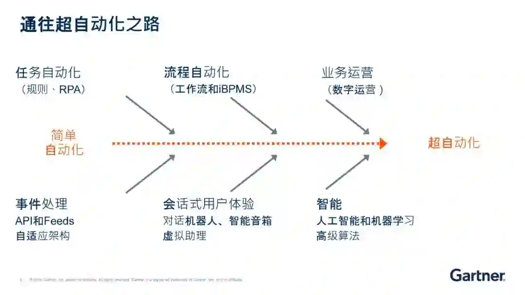超自动化是多种机器学习(ML)、打包软件和自动化工具相结合的产物。Cearly说,超级自动化不仅涉及可用工具的广度,而且涉及自动化本身的所有步骤(发现、分析、设计、自动化、测量、监视和重新评估)。理解自动化机制的范围,它们之间的相互关系以及如何将它们组合和协调是超自动化的重点。超自动化需要多种工具的结合,以渗入到人类活动的各个部分。