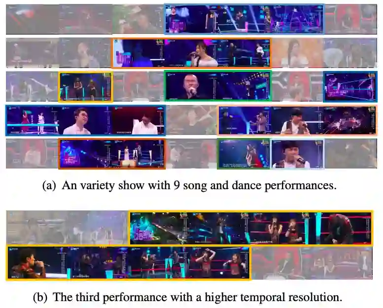 上图为其中一个视频标注的例子,(a)展示了该视频共含有9首歌和舞蹈表演,(b)为第三段小视频的时间轴放大展示。