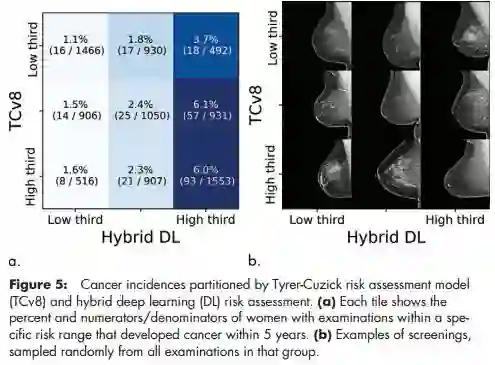接着,他们重复类似分析与 TC 模型进行比较,其中行表示按 TC 模型的低风险、中度风险和高风险(即患者得乳腺癌的风险高低)(各三分之一),列表示按混合 DL 模型的低风险、中度风险和高风险(各三分之一)。最后,他们给出了混淆矩阵中每个单元格的示例乳房 X 光照片。