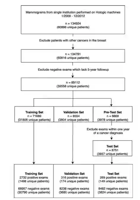 在 2009 年 1 月 1 日至 2012 年 12 月 31 日间,研究人员在一家大型三甲学术医疗中心收集了 60886 名患者的连续数字筛查乳房 X 光照片。对于每名患者,研究人员通过医疗保健系统内的五家医院获得结果,并辅以乳腺 X 光信息系统电子病历(Magview Version 8.0.143; Magview, Burtonsville, Md)中的病理发现。