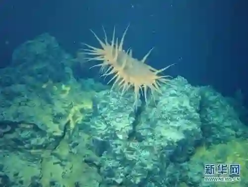 “蛟龙”号在天休热液区发现栖息在海底硫化物上的海葵(3月23日摄)。新华社发