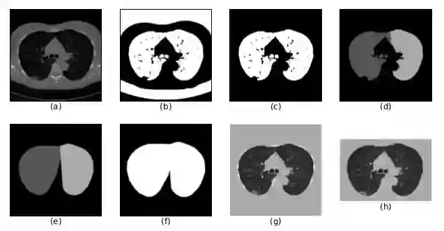 掩膜提取:在2D切片上,首先使用标准差为1的高斯滤波和阈值为-600的处理得到肺部以及周围较暗部分的掩膜,如上图b所示,然后进行连通性分析去除小于30mm2的connected component和离心率大于0.99的部分(some high-luminance radial imaging noise),再计算得到二值的3D矩阵中所有的3D connected component,且仅保留非边缘部分(用于去除肺部周围较暗的部分)以及体积在0.68~7.5L之间的部分,结果如上图c所示;