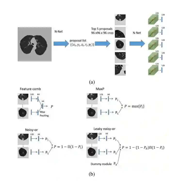 基于置信检测(the detection confidence)选出top-5结节并评估其癌症可能性,最后将此概率与Leaky noisy-or模型相结合评估患者患癌的可能性。