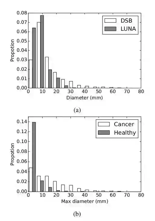 上图为结节分布情况图。其中,图a为DSB(NDSB3)与LUNA(LUNA16)数据集中结节直径分布情况;图b为DSB数据集中患癌患者与健康人群的最大结节直径分布情况。