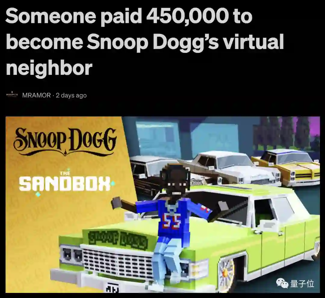 在Sandbox游戏平台上,有玩家为了成为嘻哈歌手Snoop Dogg的邻居,豪掷45万美元(约合287万)买下一套元宇宙的房子。