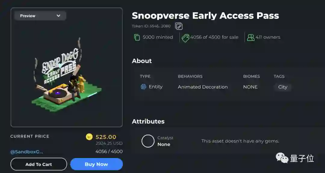 一张Snoop元宇宙的抢先体验入场券,售价525沙币,2924.25美元,折合人民币大约1.87万,而且竟然有411个人已经买了!