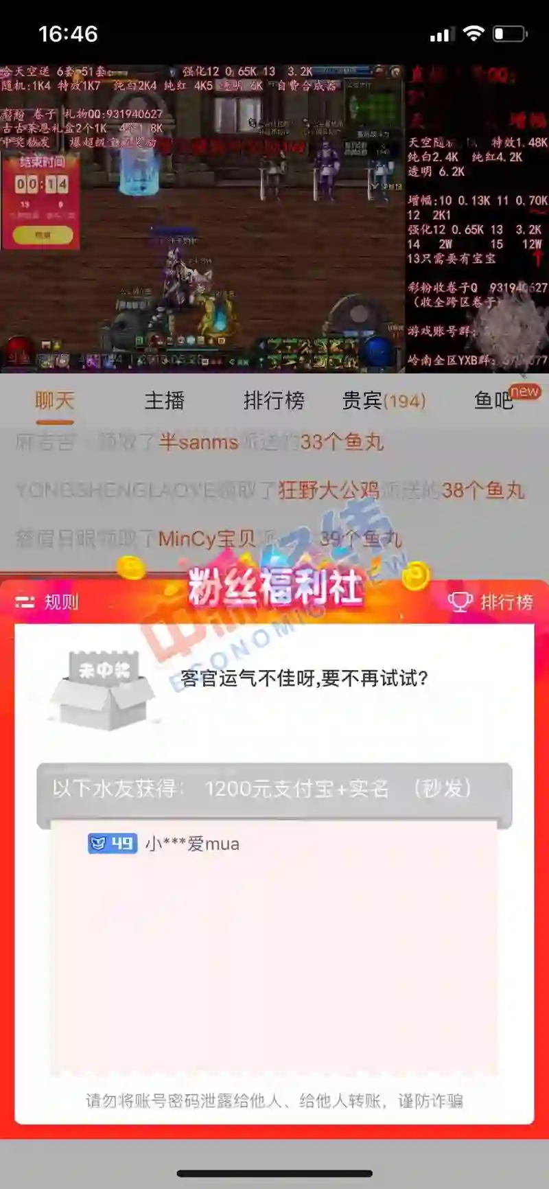 一轮抽奖结束后,下一轮抽奖随即开始,间隔约为5分钟。随着抽奖次数增多,上述主播开始上调奖金数额。在一轮奖金为1200元的抽奖中,粉丝需要打赏6“鱼翅”价格的“办卡”礼物才能参与。不过,礼物价格越高,参与的人也越少。