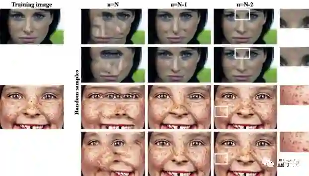 第一,当图像块的差异较大时,无法学到很好的分布,容易导致不真实的现象出现。下图中人脸图像就是很好的例子,直接使用人脸图像训练SinGAN,生成的图像非常不真实(n=N列)。后两列是将原图降采样后输入N-1层和N-2层产生的输出结果,虽然不真实感有所降低,但图像和原图的差异也变得非常小。