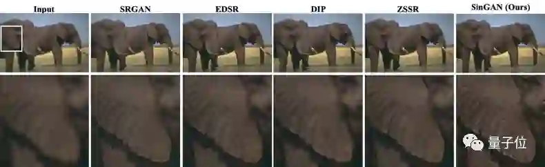在一张低分辨率图像上训练SinGAN,不断将图像上采样并输入最精细级别的生成器中,可以达到超分辨率的效果。下图是SinGAN和其他超分辨率方法的效果对比。