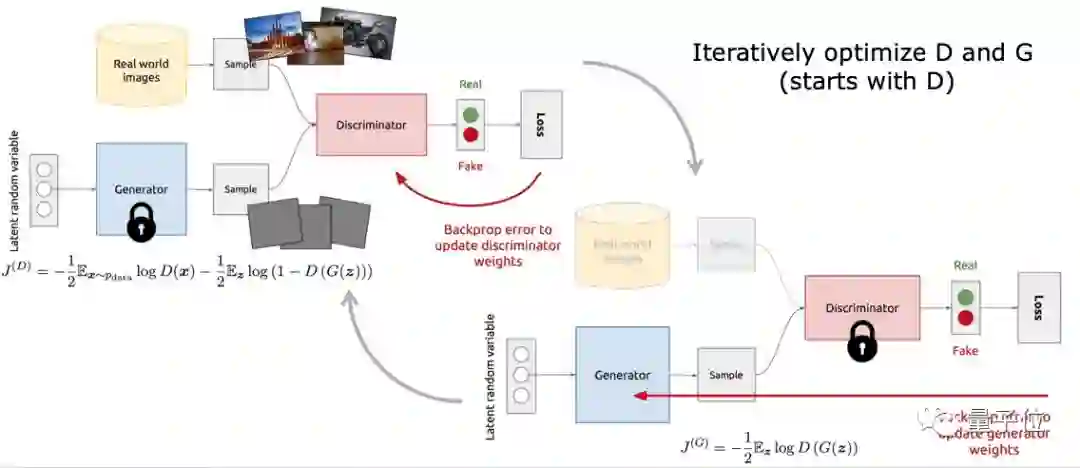 GAN采取迭代式的训练方式。从D开始,固定G的参数,选取一批真实数据和一批生成数据,根据损失函数J(D)进行梯度回传与参数更新;接下来训练G,固定D的参数,选取一批生成数据,根据损失函数J(G)进行梯度回传与参数更新……以此循环往复。