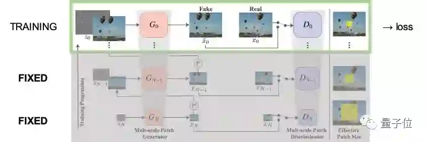 SinGAN采用逐层训练的方式,从第N层(最粗糙的层)开始,每层训练结束后参数就固定下来,接着训练下一层,如下图所示: