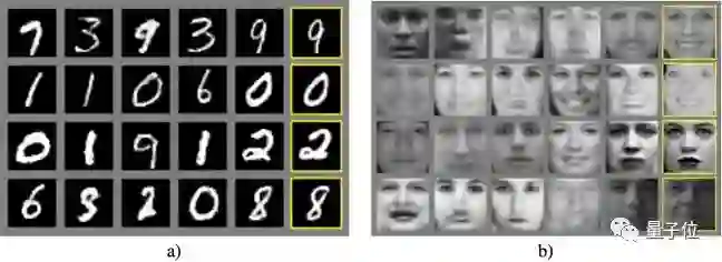简单地说,GAN可以在一个数据集上以无监督的方式进行训练,进而可以生成与原数据集中样本相似的新样本。如下图,a)图中的GAN在手写数字数据集MNIST上训练,b)图在人脸数据集TFD上训练。黄框中的图像为训练数据集中的图像,其余为GAN生成的图像。