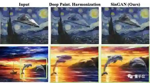 在一张图像上训练SinGAN(如下图梵高的《星夜》)。在图像中加入“不和谐”因素(如一个非常“不和谐”的飞船),输入某中间尺度生成器后,输出的结果实现了图像整体风格的和谐化。下图是两个例子以及和Deep Paint Harmonization方法的对比。