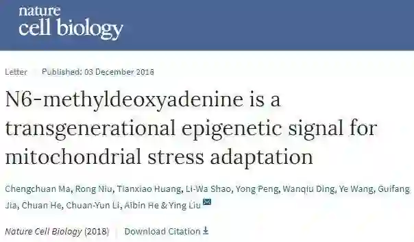 2018年12月3日,北京大学分子医学研究所、北大-清华生命科学联合中心刘颖课题组在Nature Cell Biology在线发表题为“N6-methyldeoxyadenine is a transgenerational epigenetic signal for mitochondrial stress adaptation”的论文,报道秀丽隐杆线虫可以将亲代受到的线粒体胁迫信息通过DNA和组蛋白甲基化传递给子代,使子代对线粒体胁迫有更好的适应性。
