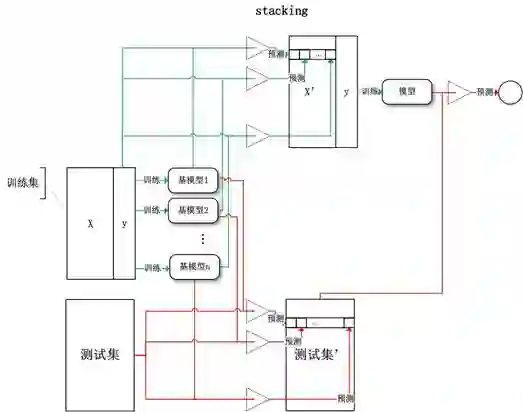Stacking:将训练好的所有基模型对训练基进行预测,第j个基模型对第i个训练样本的预测值将作为新的训练集中第i个样本的第j个特征值,最后基于新的训练集进行训练。同理,预测的过程也要先经过所有基模型的预测形成新的测试集,最后再对测试集进行预测: