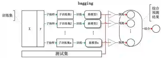 Bagging:基于数据随机重抽样的分类器构建方法。从训练集从进行子抽样组成每个基模型所需要的子训练集,对所有基模型预测的结果进行综合产生最终的预测结果 :