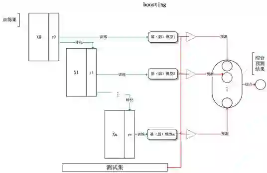 Boosting(Adaptive Boosting的简称),基于错误提升分类器性能,通过集中关注被已有分类器分类错误的样本,构建新分类器并集成。其思想为模型每次迭代时通过调整错误样本的损失权重,提升对数据样本整体的处理精度。Boosting与Bagging 相比来说最大的区别就是 Boosting是串行的,而Bagging中所有的分类器是可以同时生成的,之间没有什么关系,而Boosting中则必须先生成第一个分类器,然后根据第一个分类器的结果生成第二个分类器,依次往后进行。