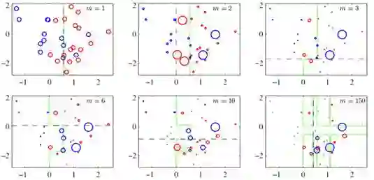 上图(图片来自prml p660)就是一个Boosting的过程,绿色的线表示目前取得的模型(模型是由前m次得到的模型合并得到的),虚线表示当前这次模型。每次分类的时候,会更关注分错的数据,上图中,红色和蓝色的点就是数据,点越大表示权重越高,看看右下角的图片,当m=150的时候,获取的模型已经几乎能够将红色和蓝色的点区分开了。