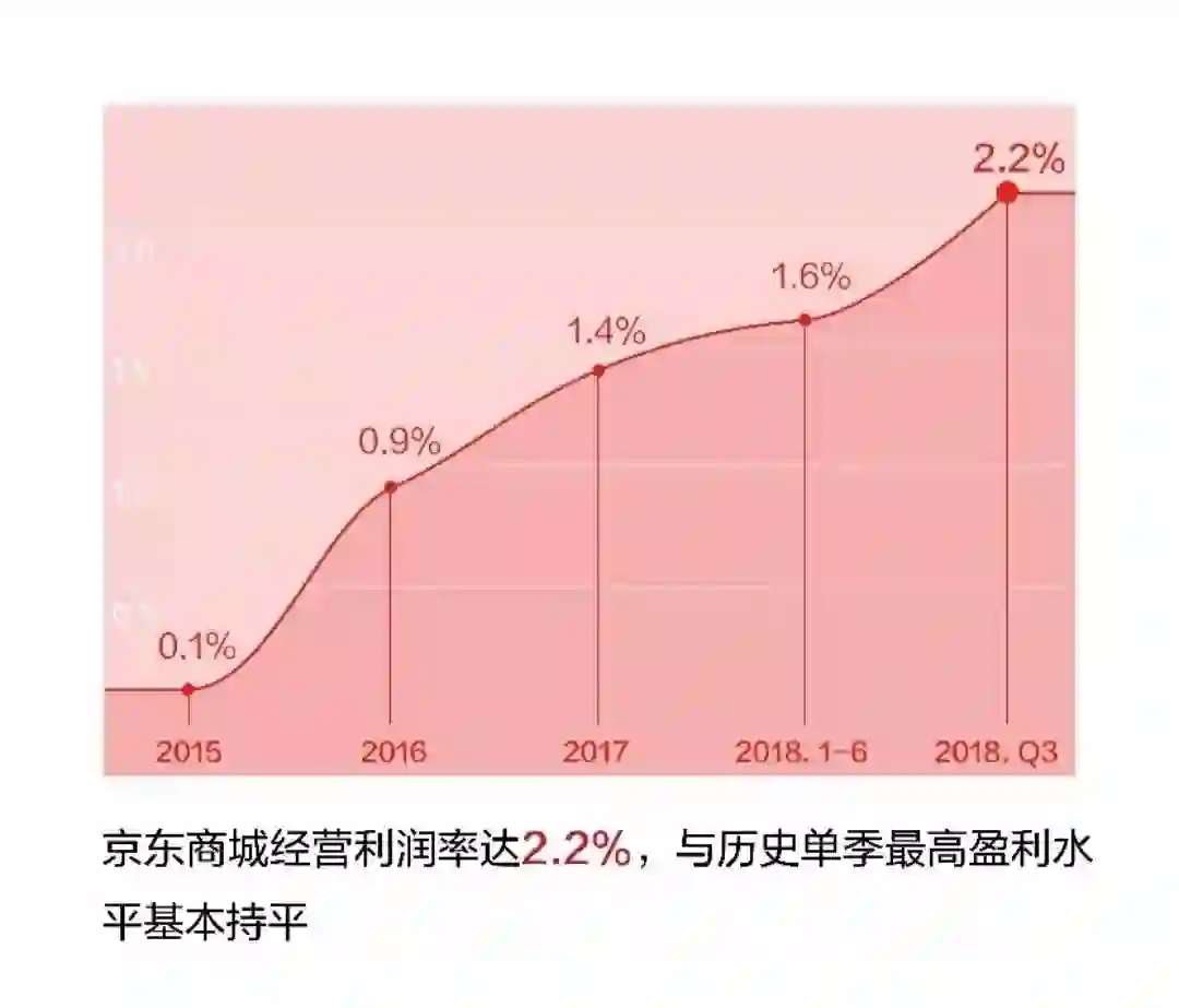 过去三年间,京东商城的经营利润率从2015年的0.1%提升到2018年第三季度的2.2%,但比起去年同期利润率稍有下降。