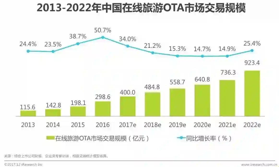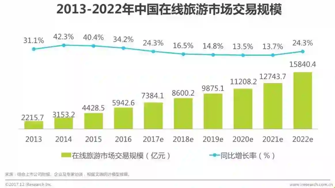 艾瑞分析,随着旅游消费者数量和消费金额的增加,以及旅游细分市场的扩张,预计2018年之后在线旅游市场交易规模将会保持平稳增长,增长幅度维持在14.0%左右,而2022年冬奥会期间将会较2021年有较大增长。