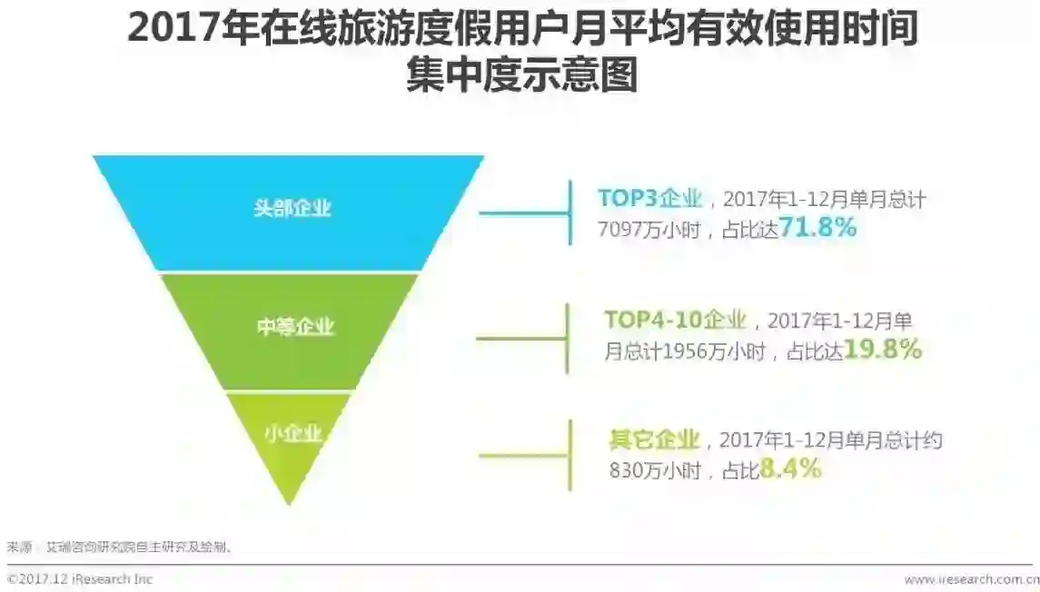 艾瑞监测数据显示,2017年中国在线旅游度假行业头部企业占据71.8%的用户使用时长,中等企业占比达19.8%,而小企业只有8.4%的占比。艾瑞分析,随着中国在线旅游度假行业的并购整合,其行业集中度将会进一步提高,流量将成为各家企业的首要争夺点。